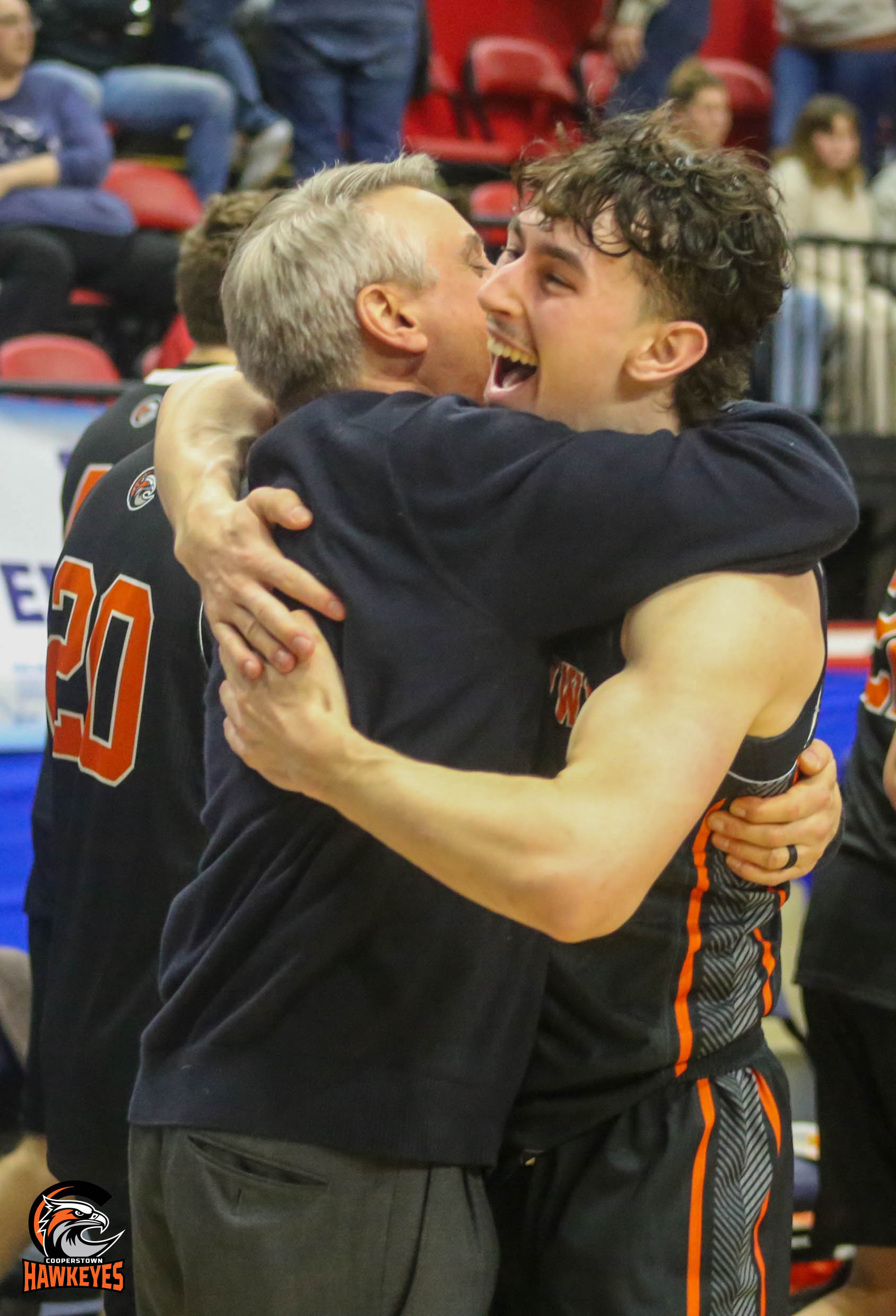 (Cooperstown Coach John Lambert hugs senior forward Cooper Coleman after the championship win Sunday, March 22, in Binghamton. Photo by Greg Klein.)